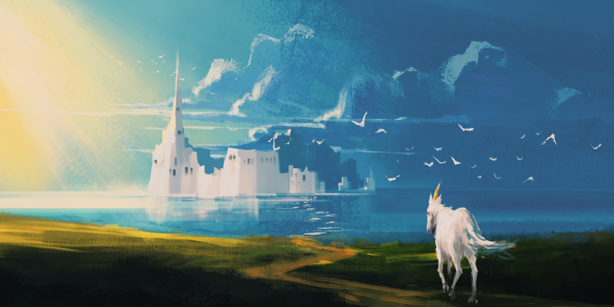 Created by Zishan Liu, a Concept Artist and Designer from China, who says, "All ideas must come from life!" This image inspires visions of wonder and beauty as the unicorn journeys towards a gleaming white fortress. The image is done as a 3d illustration.
